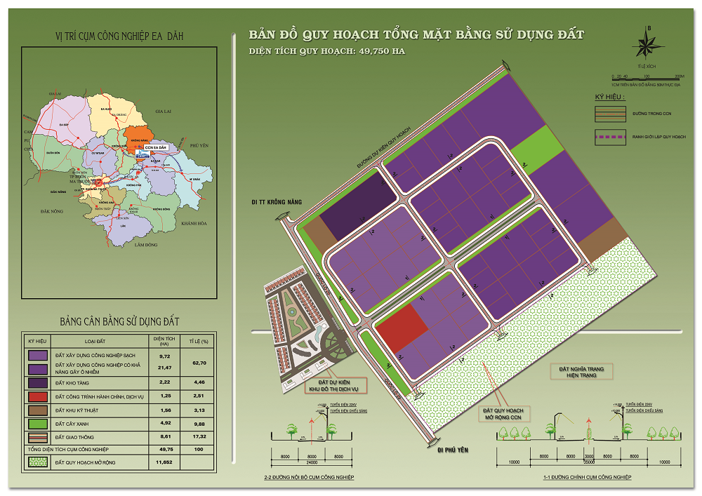 2. Quy mô diện tích: Tổng diện tích quy hoạch Cụm công nghiệp Ea Dăh là 49,75ha.